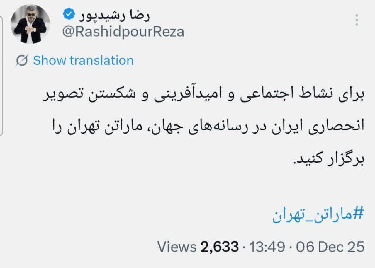 در حالی که روز گذشته ماراتن کیش با هنجارشکنی تمام عیار برگزار شد و دادستان کیش از تشکیل پرونده قضایی برای برگزارکنندگان این برنامه خبر داد، رشیدپور پیشنهاد برگزاری این ماراتن را در تهران داده است.