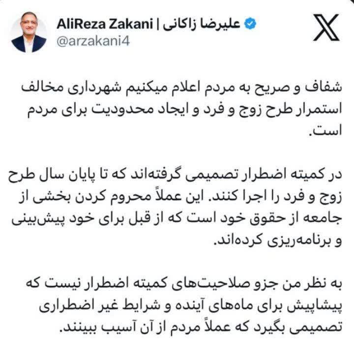 علیرضا زاکانی شهردار تهران در صفحه شخصی خود در ایکس نوشت: صریحا میگوییم که شهرداری مخالف استمرار طرح زوج و فرد است