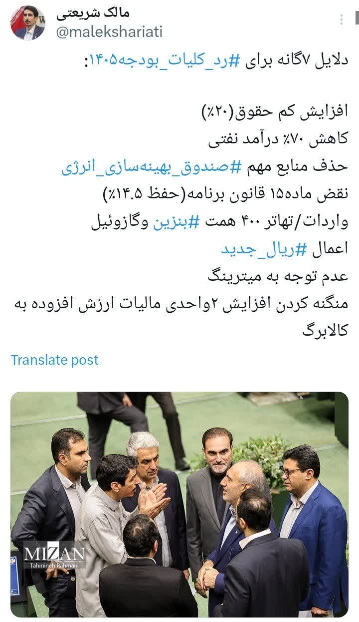 مالک شریعتی نماینده مردم تهران در مجلس هفت دلیل برای رد کلیات بودجه ۴۰۵ را در فضای مجازی منتشر کرد.