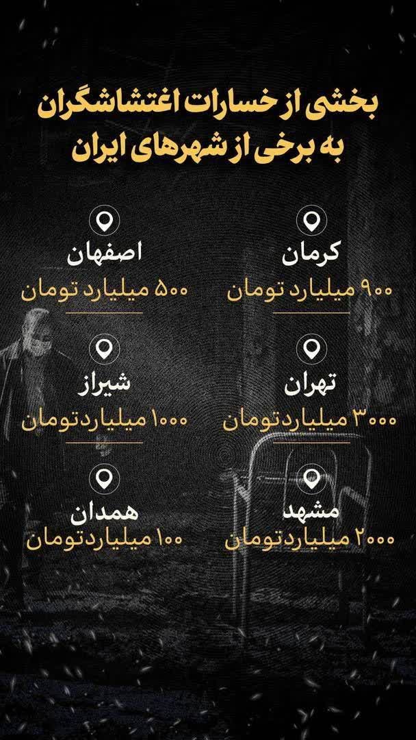این خسارات تنها بخشی از آسیبها در دو شب اول آشوب محاربین در برخی از شهرهای ایران است و عدد نهایی خسارات بسیار بیشتر گزارش شده است.