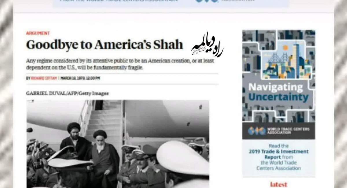 تیتر مجله فارین پالیسی در سال ۱۳۵۷ بعد از فرار شاه و بازگشت امام: "خداحافظ شاهِ آمریکایی!"