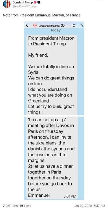 یک منبع نزدیک به ماکرون گفته است پیام‌هایی که ترامپ منتشر کرده واقعی هستند. پاسخ‌های ترامپ، در تصویر منتشرشده در حساب تروث سوشال او دیده نمی‌شوند.