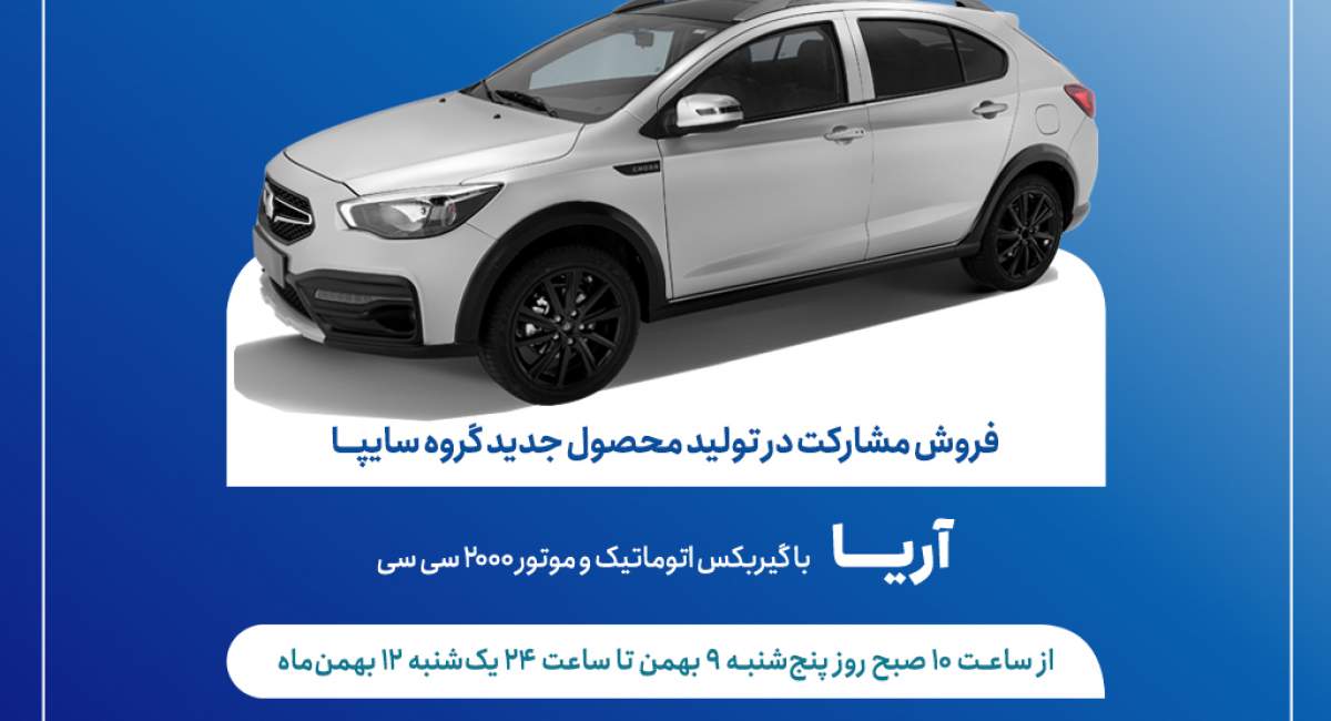 طرح فروش مشارکت در تولید خودروی جدید «آریا» از روز پنجشنبه ۹ بهمنماه آغاز میشود.
