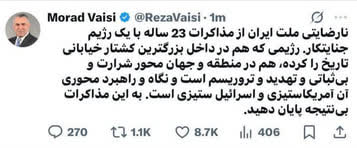 تصویری از توییت مراد ویسی در واکنش به مذاکرات ایران و آمریکا با ۴۰۰ ویو و ۹ هزار لایک را مشاهده می کنید.