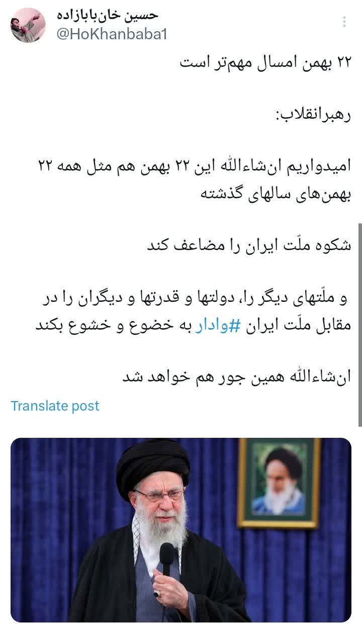 امیدوارم انشاءالله این 22 بهمن هم مثل همه 22 بهمن های سال گذشته شکوه ملت ایران را مضاعف کند.