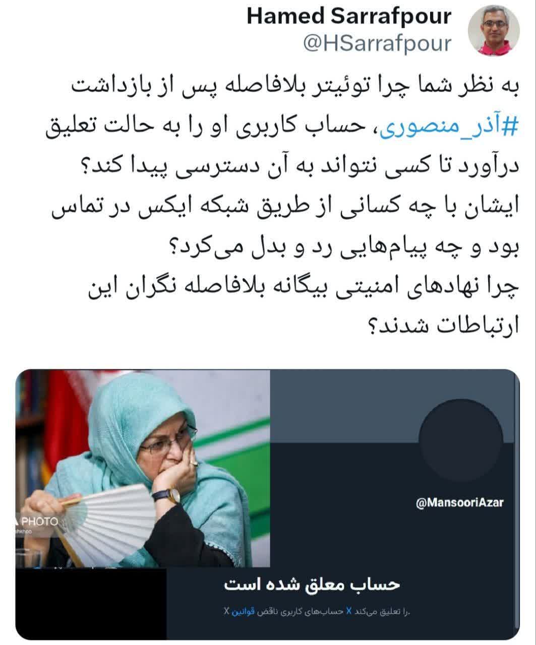چرا توئیتر بلافاصله پس از بازداشت آذر منصوری، حساب کاربری او را به حالت تعلیق درآورد تا کسی دسترسی پیدا نکند؟