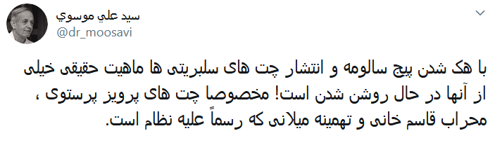 گروه سیاسی جهان نیوز: روز گذشته و همزمان با هک صفحه اینستاگرام «سالومه»، مجری فاسد شبکه ضدانقلاب و معاند «من و تو» مشخص شد که تعداد قابل توجهی از سلبریتی ها با این فرد بدنام و به طریق اولی با شبکه من و تو در ارتباط بوده اند. در بین تصاویر منتشرشده از گفتگوی به ظاهر هنرمندان با خانم مجری مزدور، گفتگوی پرویز پرستویی که بیشتر شهرت خود را مدیون نقش آفرینی در فیلم های مذهبی و ارزشی است، بازتاب بیشتری پیدا کرد. گفتگوی وقیحانه تهمینه میلانی و تهمت رذیلانه او تحت عنوان «سیستم فاسد» در مرحله بعدی بازتاب ها قرار داشت. انتشار این تصاویر در فضای مجازی و خصوصا شبکه توئیتر بازتاب فروانی داشت که در ادامه بخش هایی از این واکنش ها را خواهید دید: