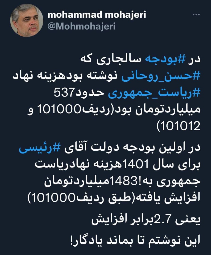 «در بودجه سالجاری که حسن روحانی نوشته بود هزینه نهاد ریاست جمهوری حدود ۵۳۷ میلیاردتومان بود (ردیف ۱۰۱۰۰۰ و ۱۰۱۰۱۲)