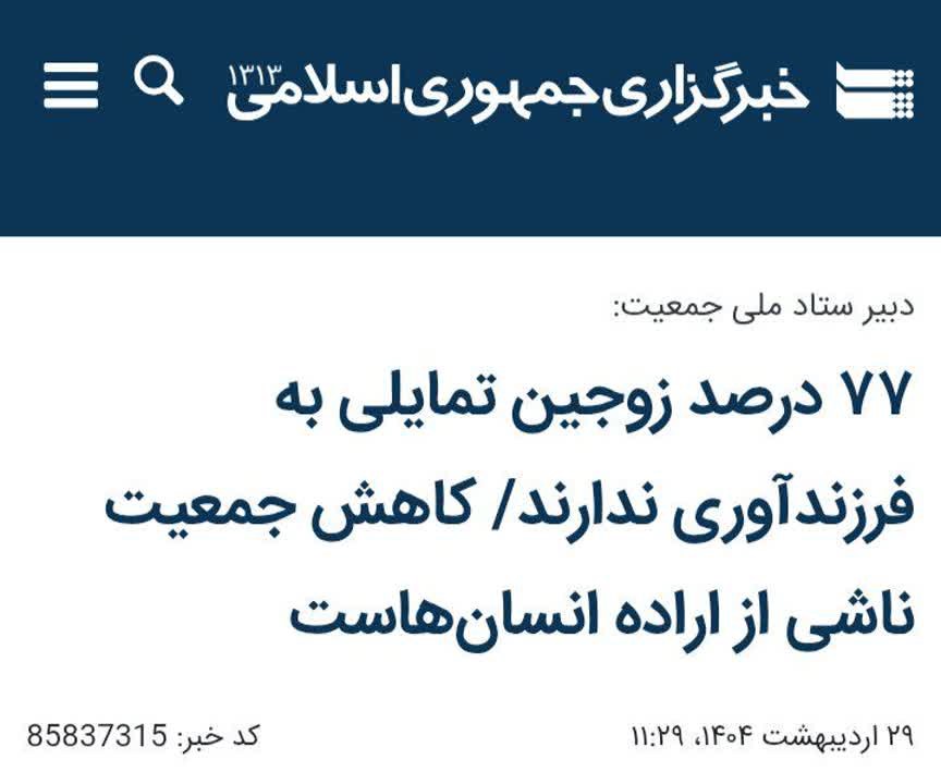 اردیبهشت امسال نیز دبیر ستاد ملی جمعیت با اشاره به پیمایش ملی «تمایلات ایرانیان به فرزندآوری»، تصریح کرد: «در این پیمایش، میزان تمایل زنان و مردان متأهل در سنین باروری (۲۰ تا ۵۰ سال) به فرزندآوری پرسیده شد و ۷۷.۷ درصد از پاسخگویان گفتهاند تمایلی به فرزندآوری ندارند».